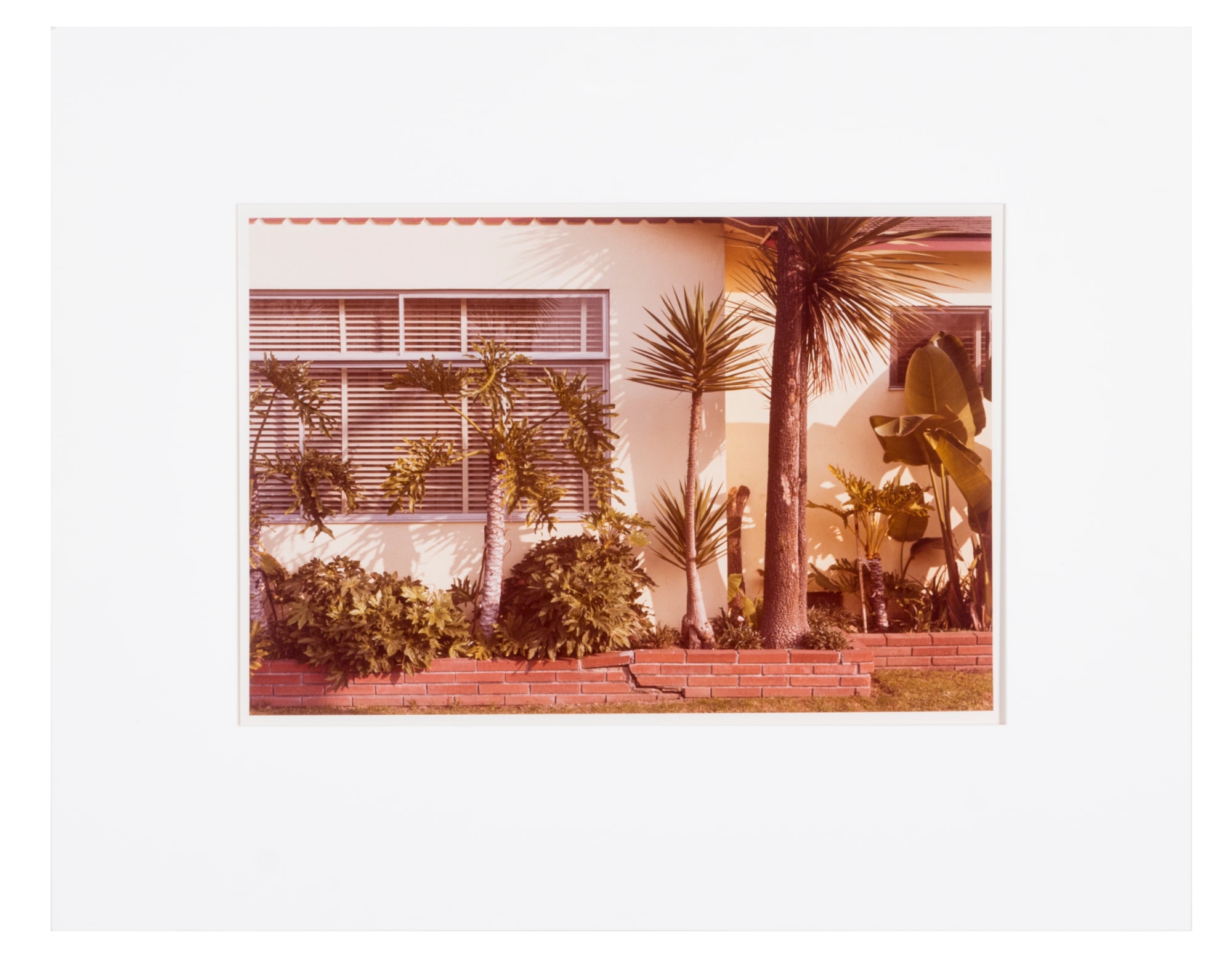 Color photograph of the exterior of a house with tropical trees and plants lining the wall.