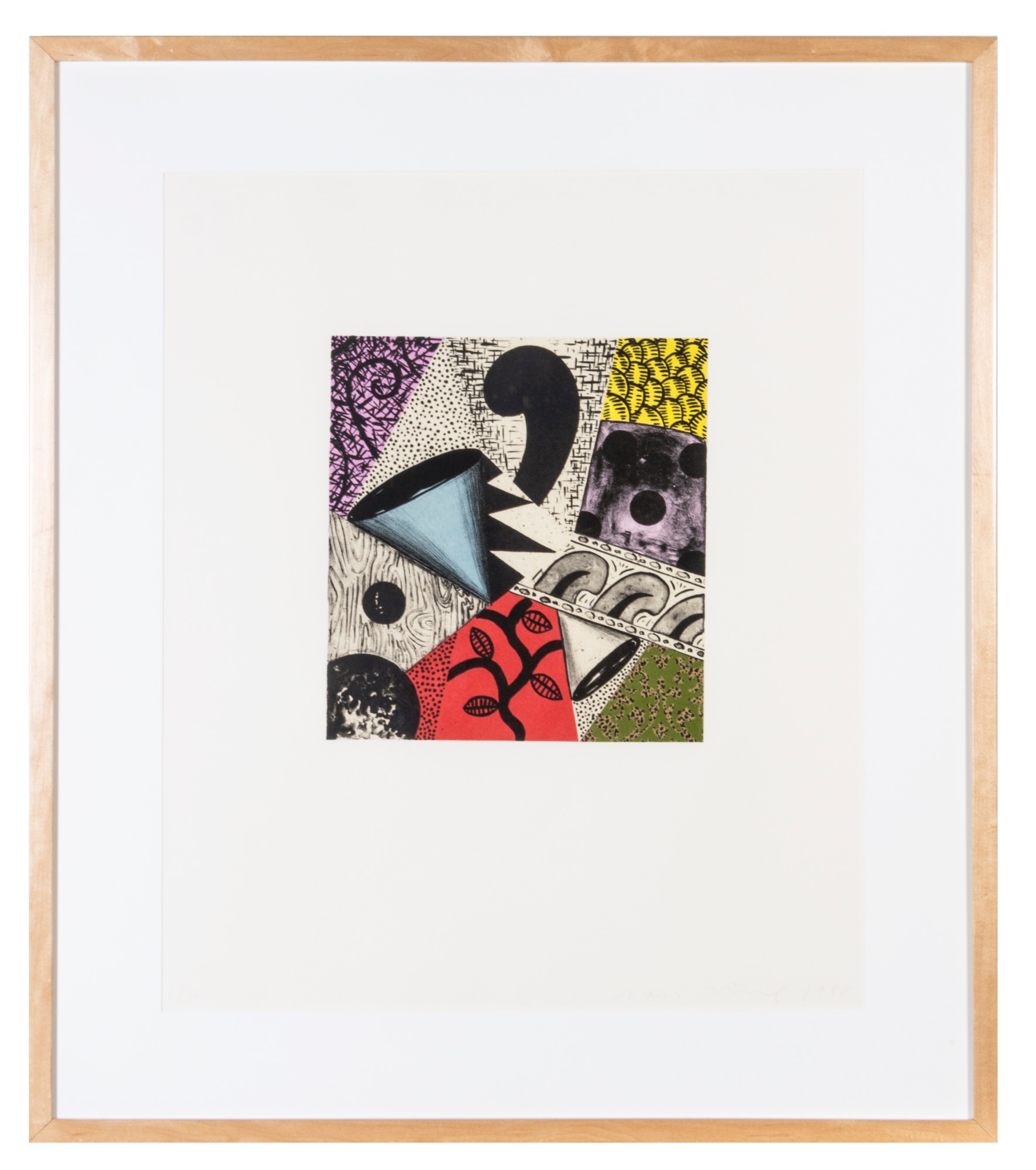 Abstract composition of various textural patterns confined to geometric spaces. Some of the sections have been collages onto the print. The green section in the right corner has velvet like fibers creating 3-D texture. Some of the segments are filled with bold colors while other utilize the color of the paper for contrast. The largest shapes include: two cones, a vine and a die.