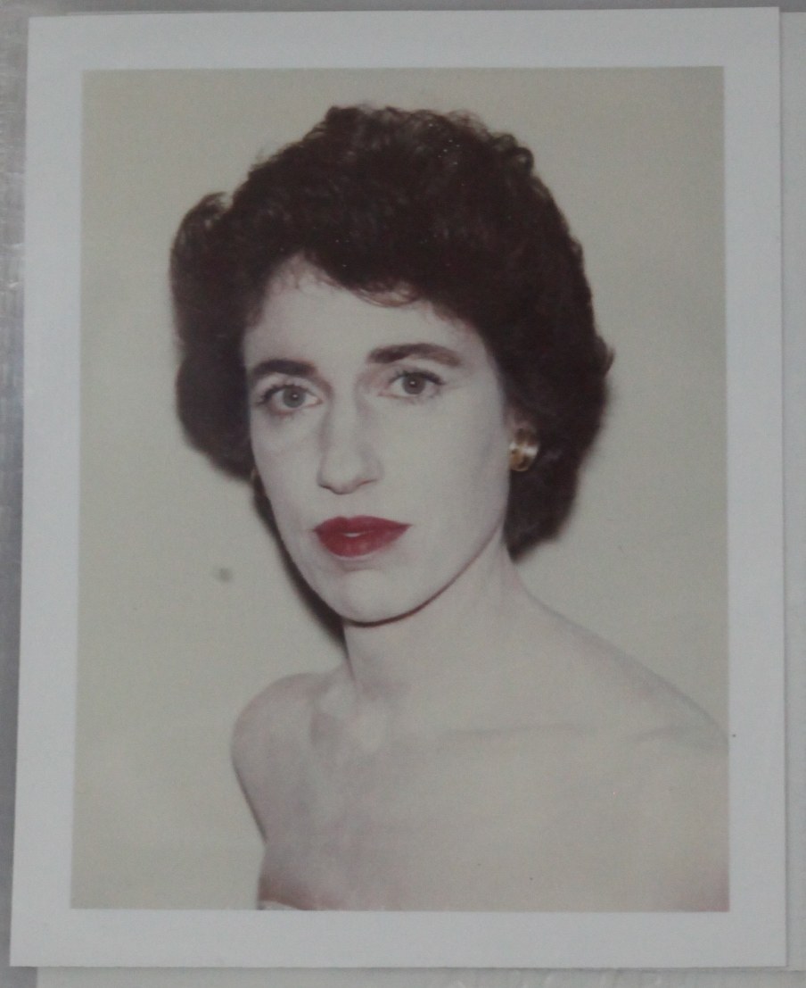 3/4, color bust portrait of Enid Beal facing proper right. She has short brown curly hair and is wearing white makeup, red lipstick, and a tube top that is barely visible. She is set against a solid off-white background.