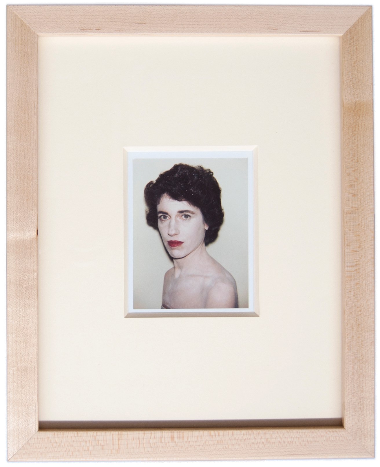 Bust portrait of Enid Beal. Her body has been powdered white and she is wearing red lipstick.