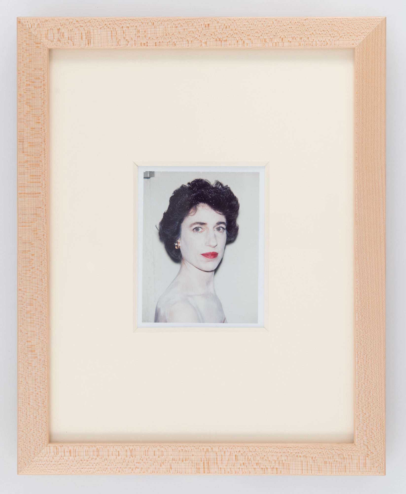 Bust portrait of Enid Beal. Her body has been powdered white and she is wearing red lipstick. Her gold earring is visible on her right ear.