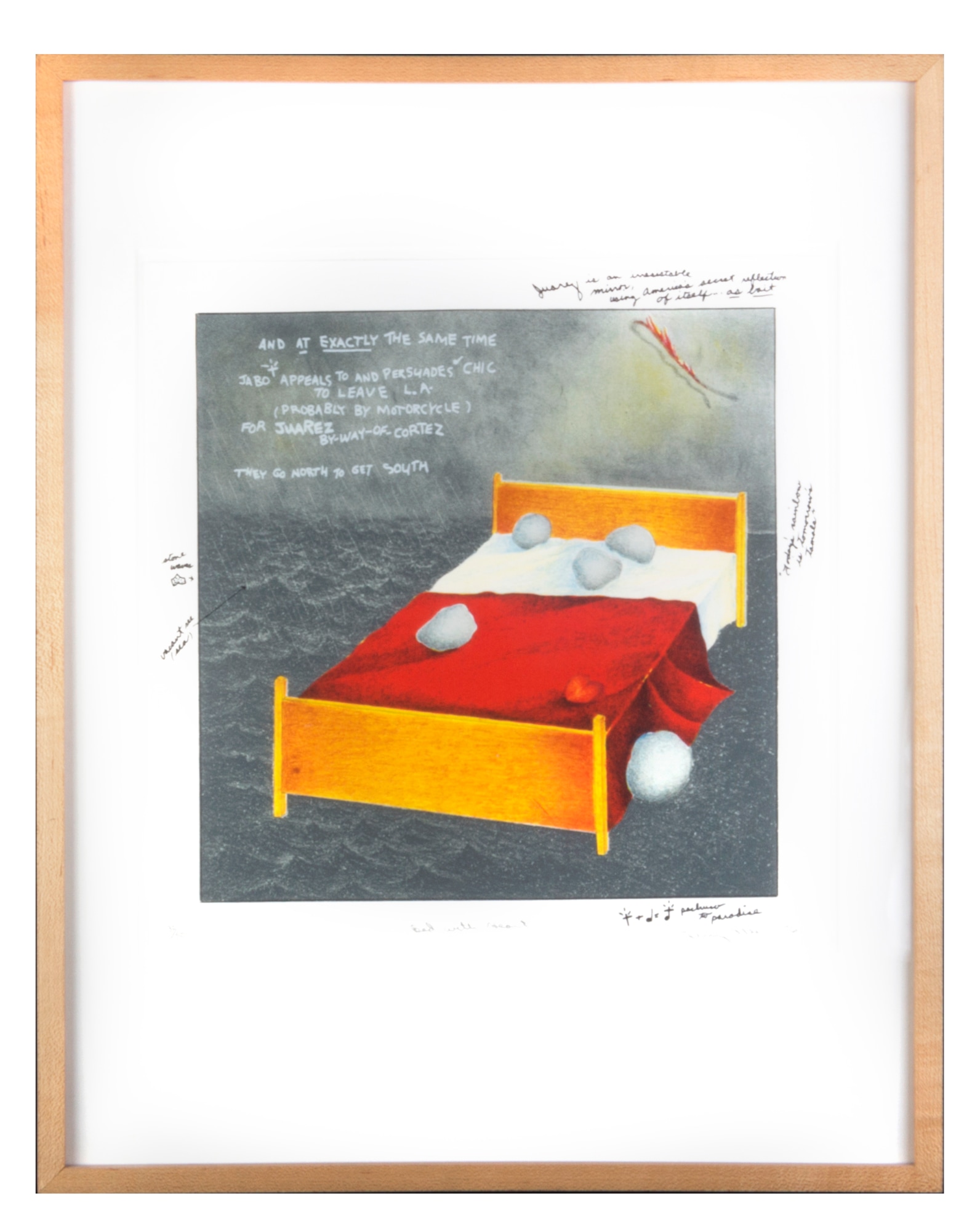 There's is a bed in the middle of a storm, floating atop a choppy sea. The bed is dressed with a red blanket and white sheet. There are four rocks on top of the bed and a heart on its left corner. There's a rock at the foot of the bee and a flaming bobby pin in the top right corner. The sky and sea are gray. There's a thin black border around the composition. Outside the border there black,handwritten style text.