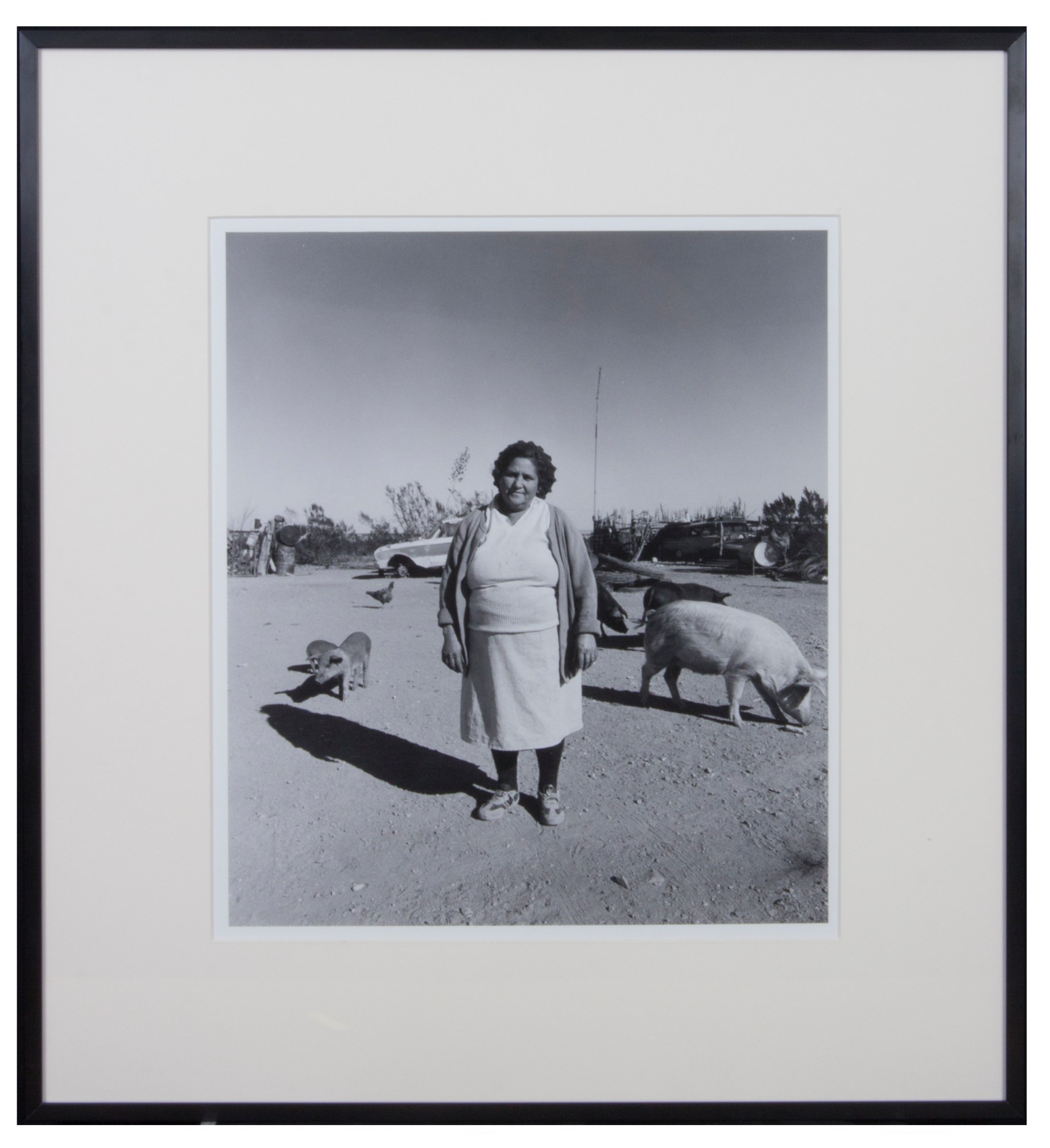 Full body portrait of a woman standing in a sandy lot of farm property. In the background there are pigs, junk cars, a chicken and an animal pen.