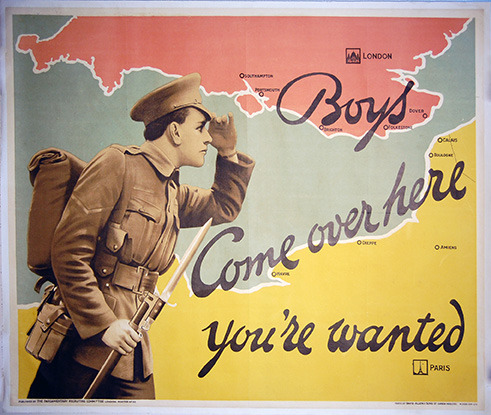 Uniformed soldier with hand on forehead looking into the distance over a map of Europe