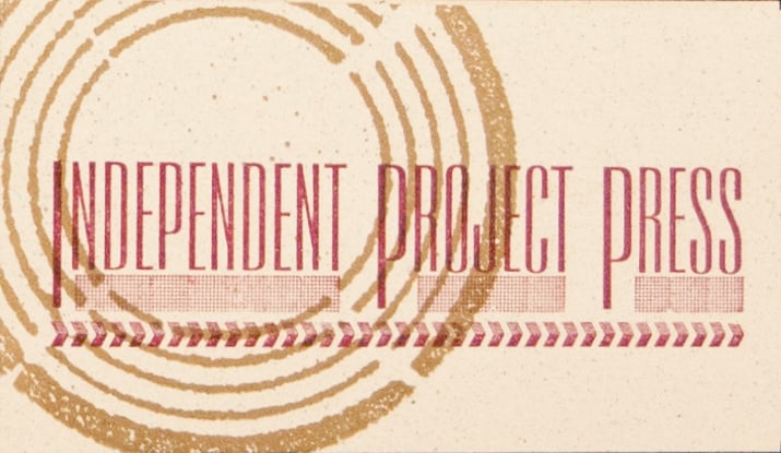 A foldable business card for the proprietor of Independent Project Press (IPP), Bruce Licher. Recto: Logo for IPP, concentric circles that are superimposed by the name of the press. Inside are linear and circular motifs designed by IPP. Text reads: "" Specializing in distinctive letterpress printing and graphics". There is also contact info present. Verso " Bruce Licher Proprietor".