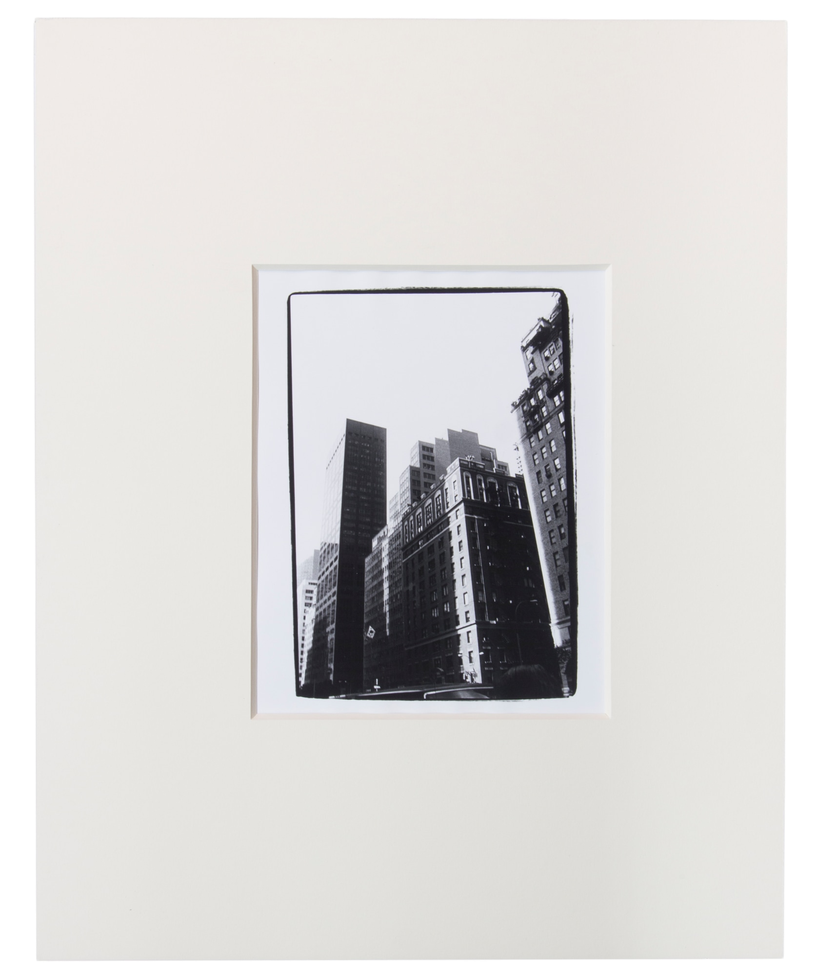 it is an image of buildings at an upward angle taken during the day. Back of photo written in pencil center bottom "FL13,00445. two warhol estate stamps in light blue.