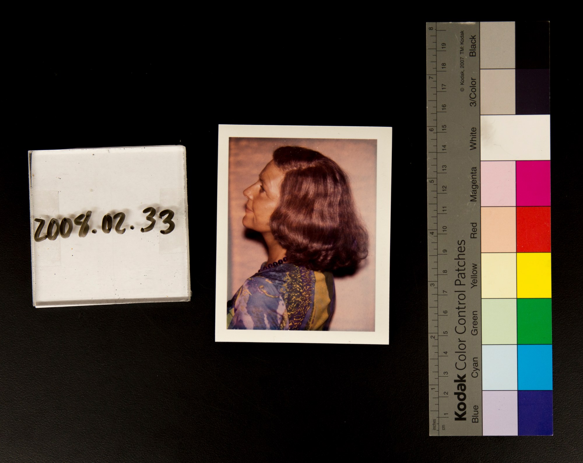 Profile, color, bust portrait of Aenne Burda. She is wearing a colorful blue dress with a blue bead necklace. She is looking to the left