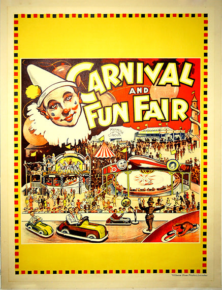 Image of jovial carnival goers enjoying a variety of rides and shows. There is a clown in a cone hat in the upper left corner and the text : "Carnival Fun Fair" in the upper right. The composition is framed by alternating blue and red squares