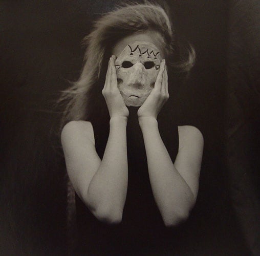Black-and-white photo of girl holding stylized clay mask to her face. She is dressed all in black and is against a black backdrop.