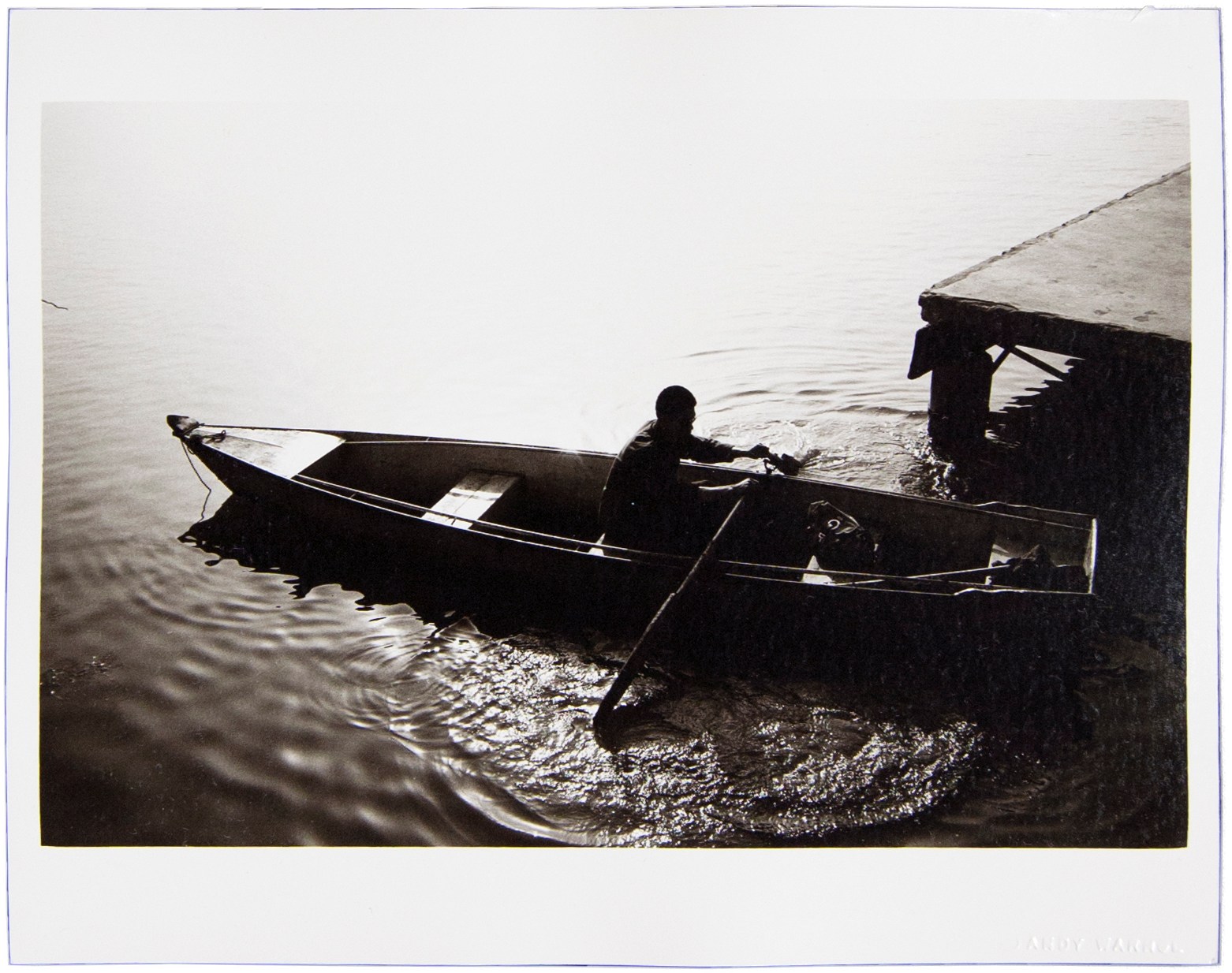 Black-and-white image, standard masking lines, of a man in a a long fishing canoe paddling away from the dock.