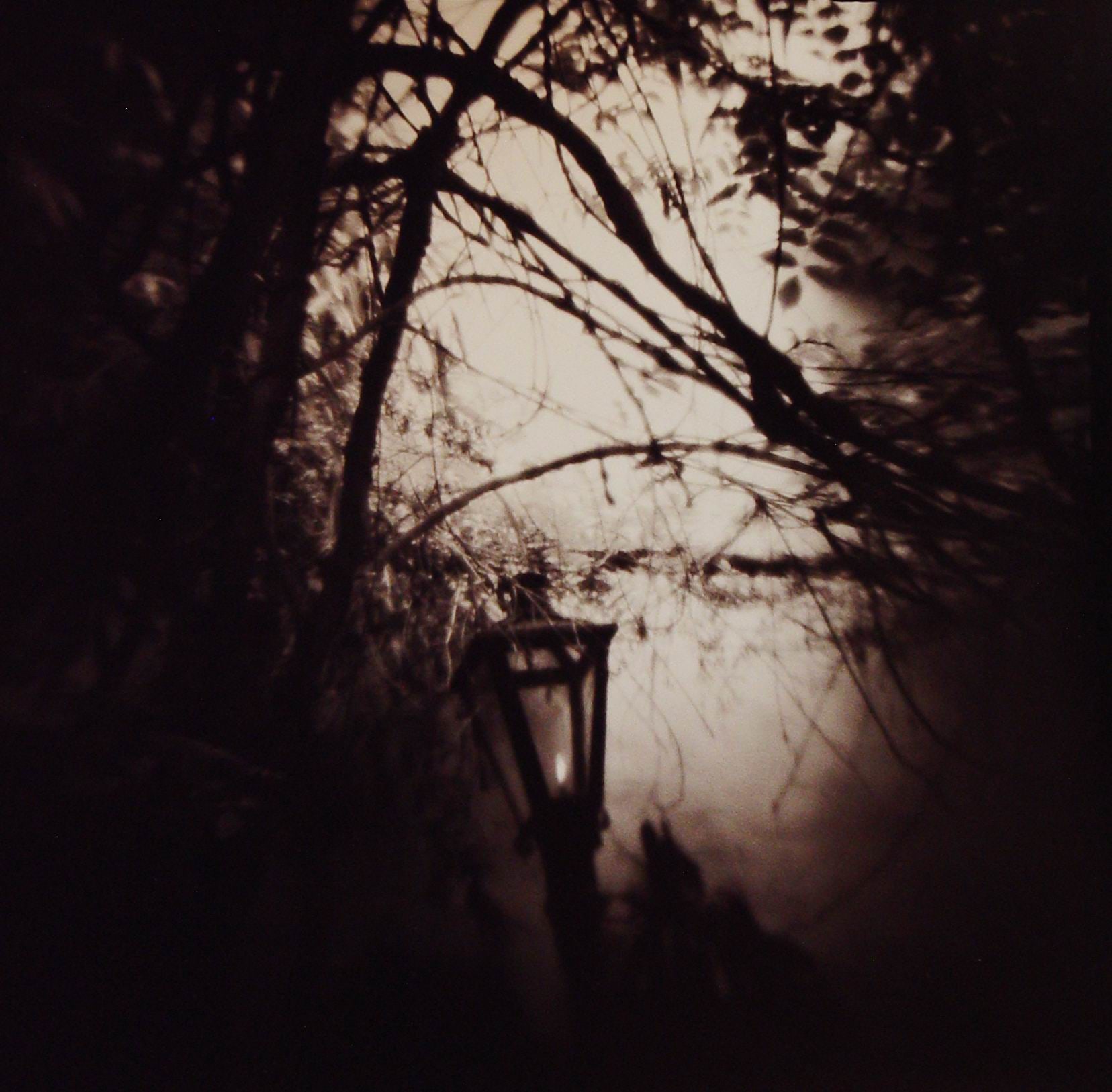 Brown toned silver gelatin print , smooth surface satin finish. Image ofa New Orleans street lamp and silhouette of trees against a light sky.