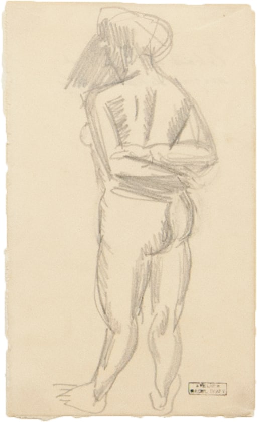 Drawing is of a nude figure standing. Their arms are behind them and they look downwards