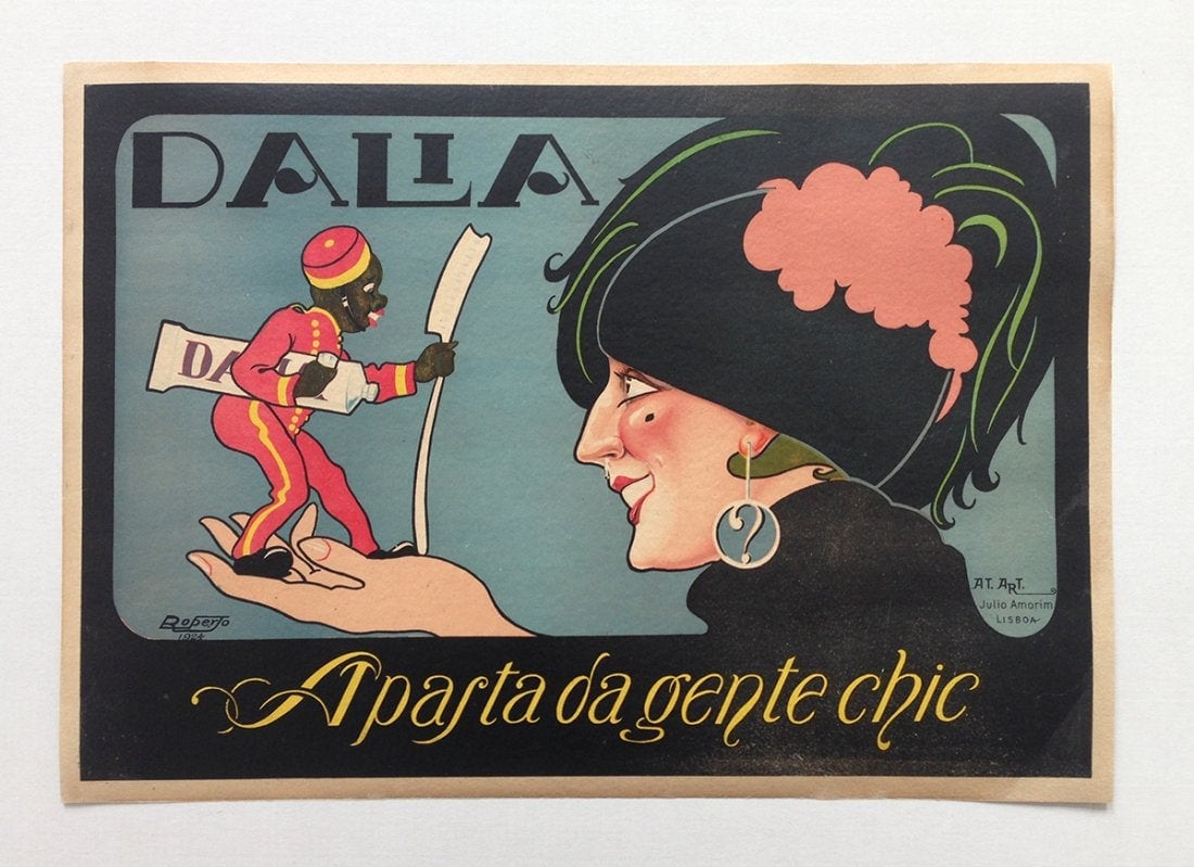 Profile of a woman in a fancy hat, smiling at a small black bell boy she is holding in her hand, bell boy is offering her a tooth brush and holding a tube of Dalia brand toothpaste