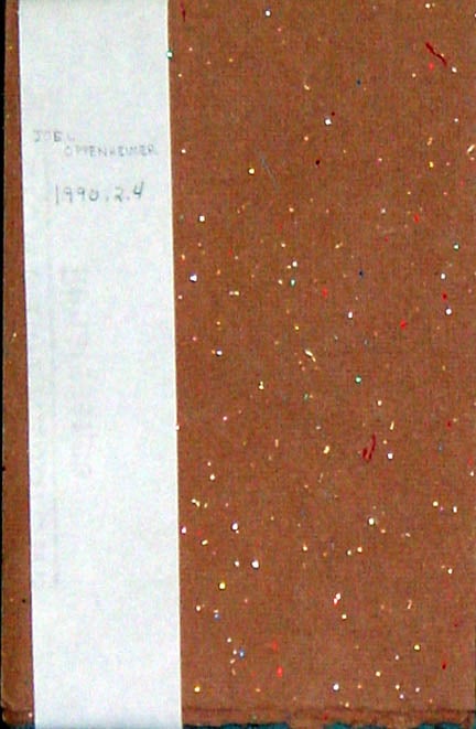 Manually printed in farmhouse parlour on various Shadwell papers hand-formed in the barn. Sabon Antiqua typeface. Handmade paper in different colors, some with sequins and glitter. "Joel" spelled out in upside down and backward perforations on spine. One page contains a lady die-cut from a map rising out of library pocket (with grommet), her head a bright red sticker seal.