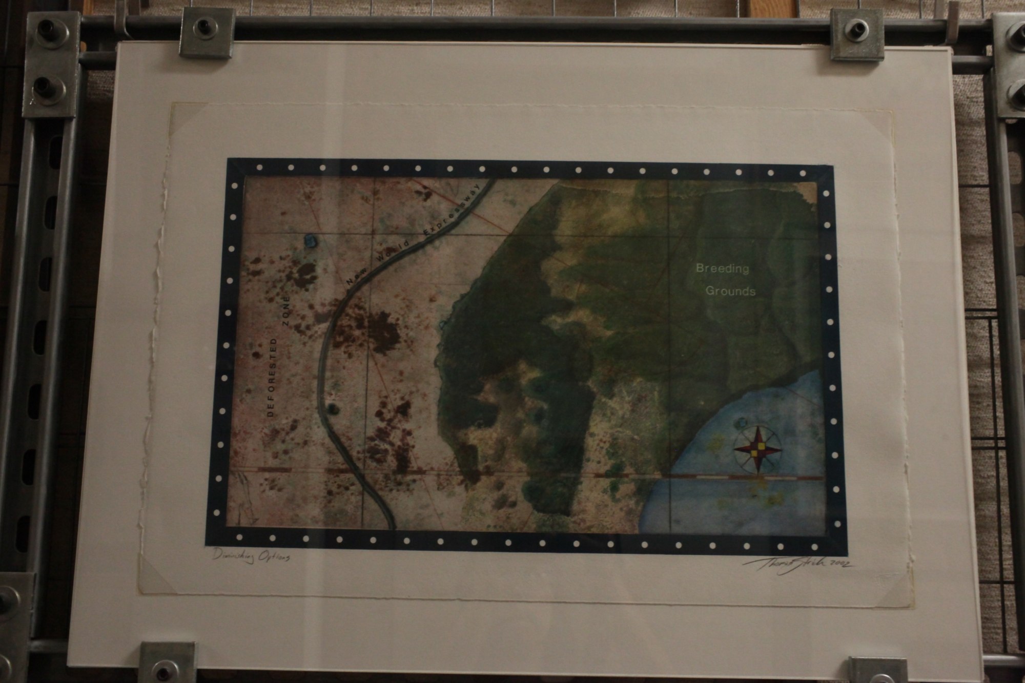 Ariel view of a map of an area of land labeled with the following text: "Deforested Zone" "New World Expressway" Breeding Grounds". On the left side of the composition the land is desert like, next to a lines to indicate a highway, a green area indicating a forest and a blue area in the bottom right corner there''s a blue area indicating a lake.