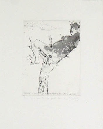 A nude, disfigured man reclines in a short, leafless tree. He faces left with his head in the top right corner. His face and part of his torso is washed in with darker, water, splotches. Along the base is a line of script: title of the piece, date, and signature - all backwards due to printing process.