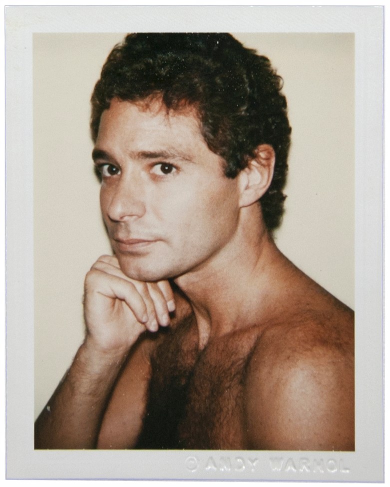 3/4 bust , topless portrait of Andy Warhol's doctor, Robert Giller. He has dark brown curly hair and brow eyes. His right hand is under his chin. He is set against a solid off-white background.