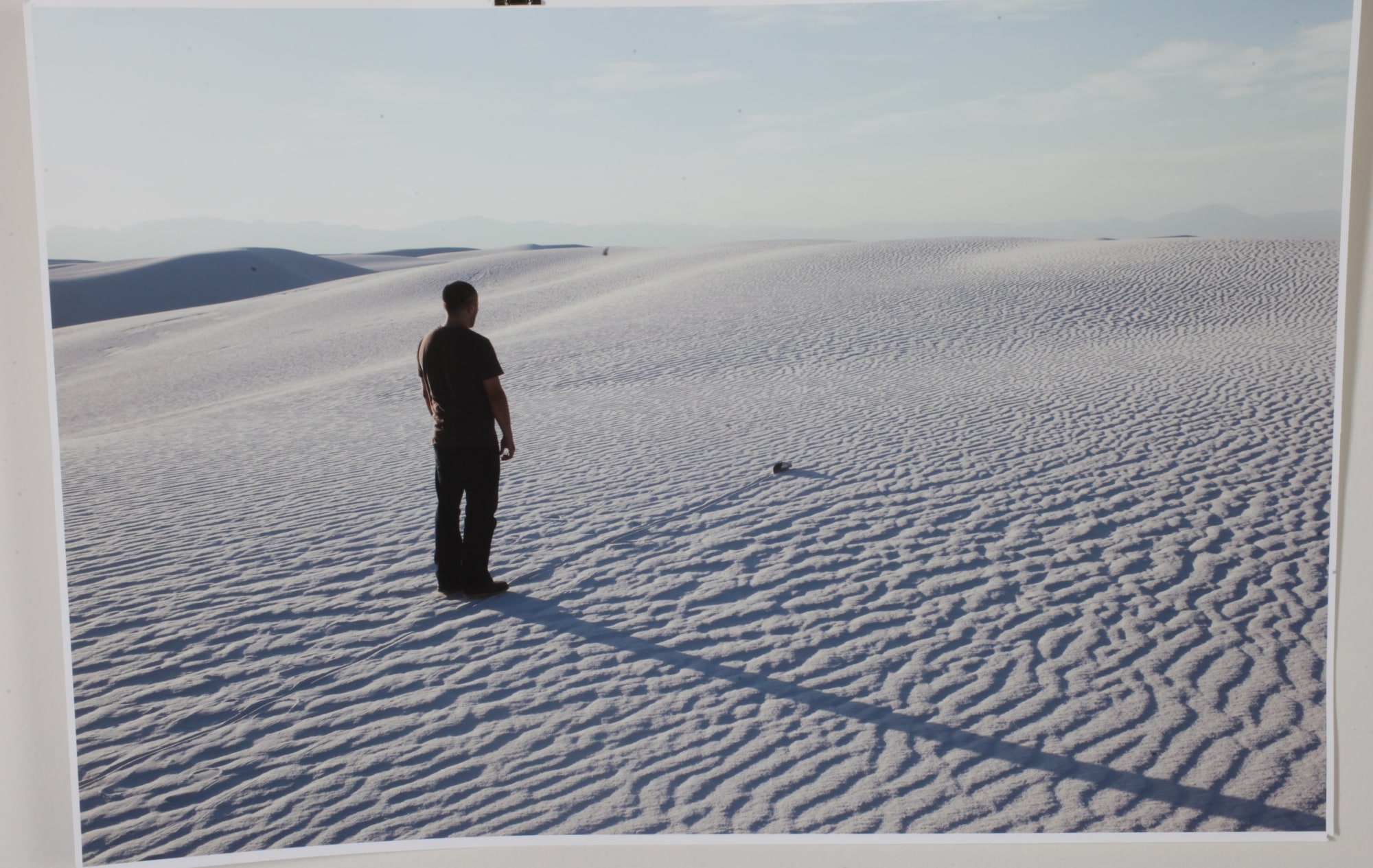 Image is a video still from an installation piece by Lamson called Draw a Line and Follow It. Image is of the artist on a dune at the White Sands National Monument in New Mexico. He is following the line created by the apparatus ( pictured in (2012.10.2).