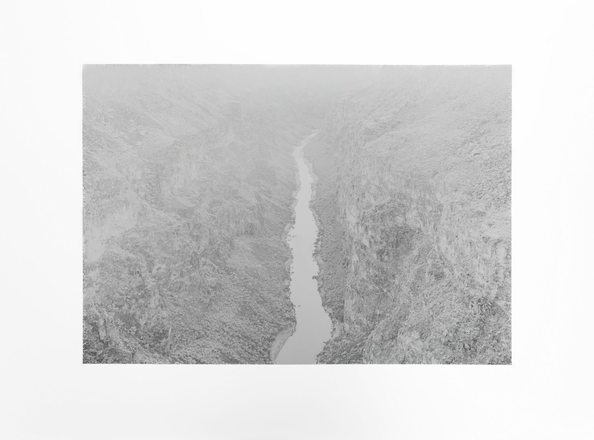 Full title: Early morning Looking North - Heading towards the source - morning into the full force of the blizzard The Upper Rio Grande On the bridge crossing The Southern entrance of the Rio Grande Gorge Taos County New Mexico U.S.A. North America 1995/2017 At the beginning of the Great Blizzard.