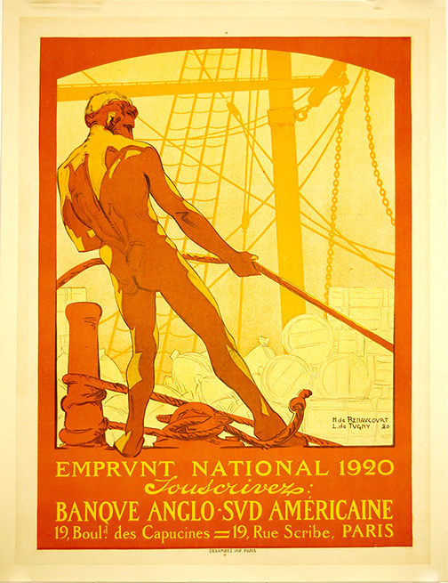 "whole: the image occupies the upper three-quarters, with the title and text positioned separately across the bottom, in yellow, against an orange-brown background. image: a nude male figure stands foreground left, his back to the viewer and pulling on a rope. A consignment of barrels, sacks and crates stands in the background, beneath a ship's rigging. text: H. de RENAUCOURT L. de TUGNY 20 EMPRUNT NATIONAL 1920 Souscrivez: BANQUE ANGLO-SUD AMÉRICAINE 19, Boul.d des Capucines = 19, Rue Scribe, Paris DEVAMBEZ IMP. PARIS [National Loan 1920. Subscribe. Anglo-South American Bank]" (https://www.iwm.org.uk/collections/item/object/7344)