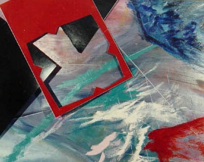 Color photo, abstract composition that is painted and incised. Black and red paper float above a painted background.