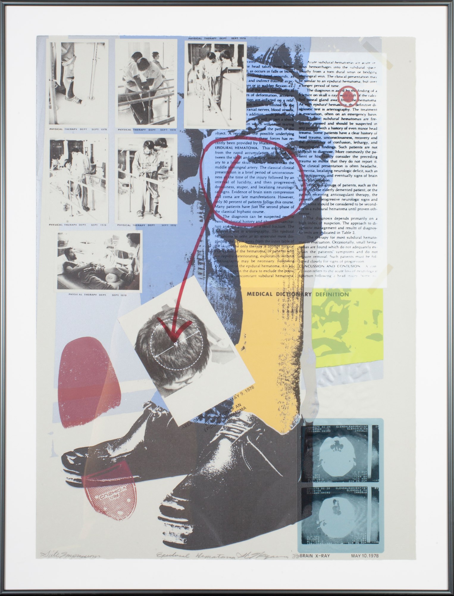 Mixed media print: photo-lithograph, photo-screenprint, relief, embossing and photo-collage elements printed in color ink on wove paper. Collage style composition that describes through printed text the medical definition, procedure, and recovery from an epidermal hemotoma as understood and experienced by the artist. The imagery includes brain scans, the artist recovering on a medical bed, and most prominently; the bottom third of a man in blue jeans wearing a yellow sock and black shoes, with one of the soles being higher than the other.