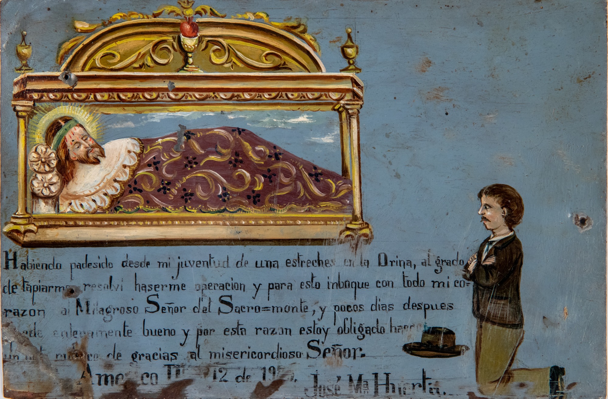 English Translation: “Having suffered since my youth from a tight bladder and urinary tract, to the point of filling up completely, I decided to have an operation and for this I prayed with all my heart to the miraculous Señor del Sacromonte, and a few days later [illegible] completely well and for this reason I am obliged to do give thanks to the merciful Lord. [illegible] [illegible] 12th day of 19(?)5. José Mahierta.”