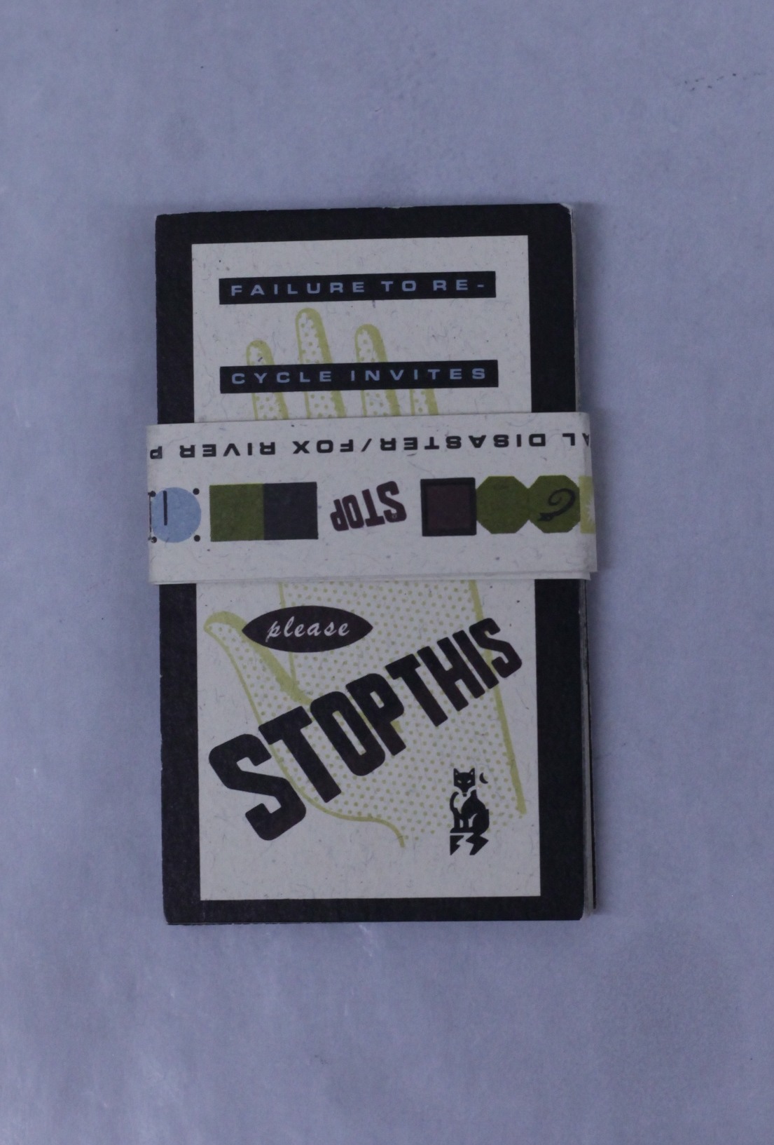 Double sided cards that feature imagery and text related to recycling. The first and last card provides project and production info.