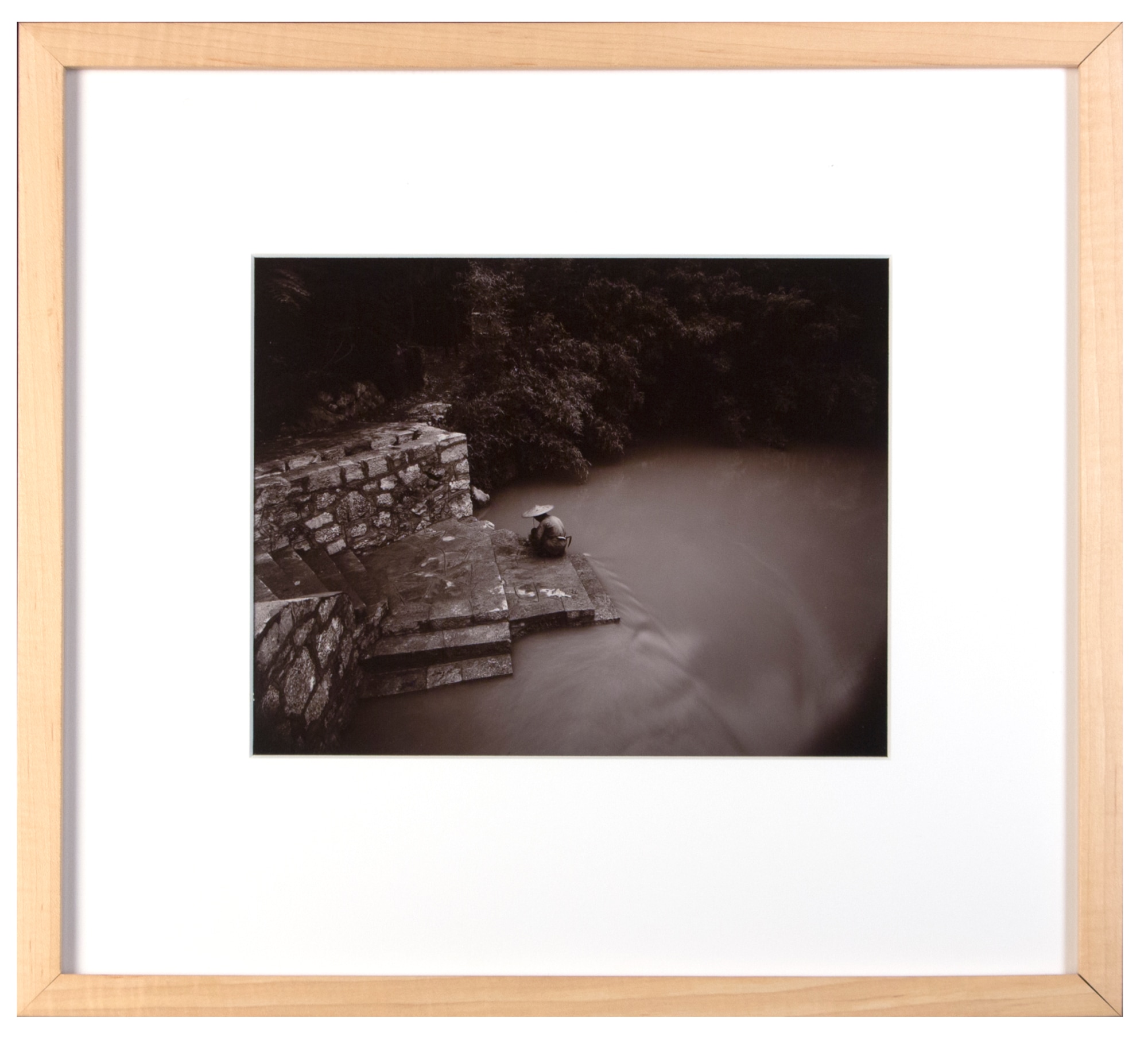 Black-and-white image of a man washing spinach in the river. He accessed the river from a wide stone staircase and he is crouching at the base of the landing. There is what seems to be a small forest in the background.