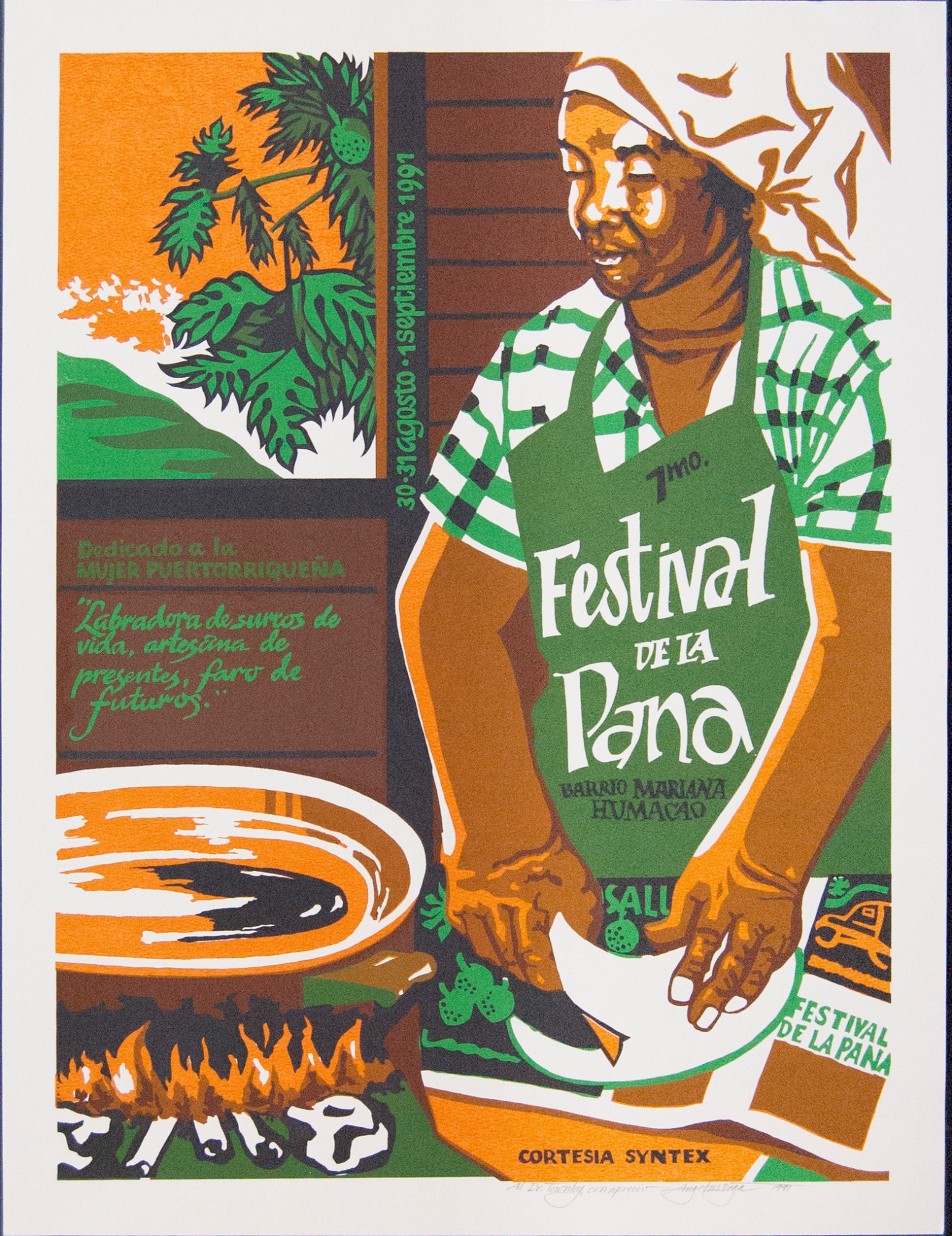 Puerto Rican woman slicing a melon standing next to a pot over fire. Orange, green, black, brown