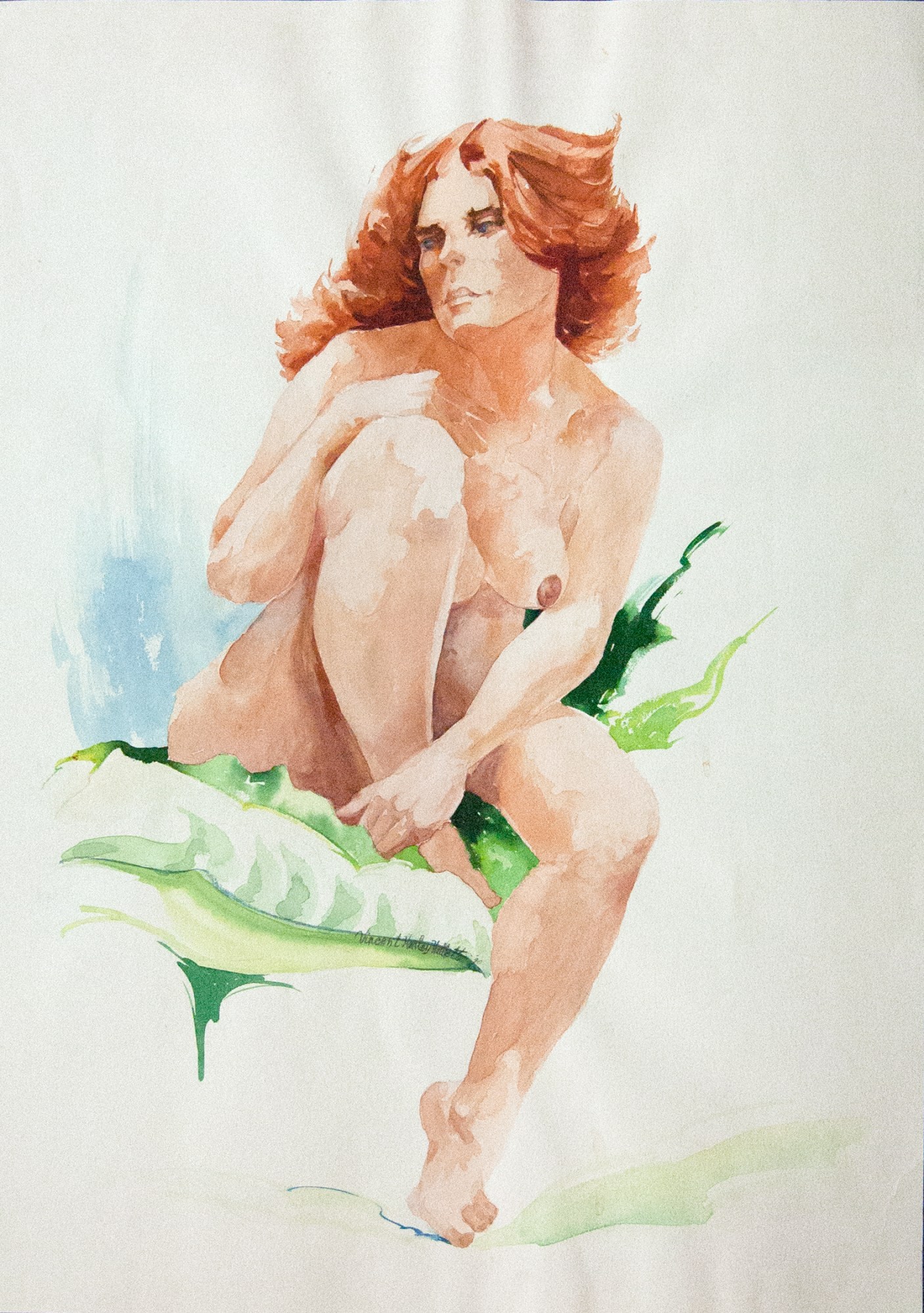 Watercolor painting of a nude, red headed woman who is sitting on a green pillow. The figure is holding her bent right leg while the left touches the floor. Colors: flesh tones, blue, green.