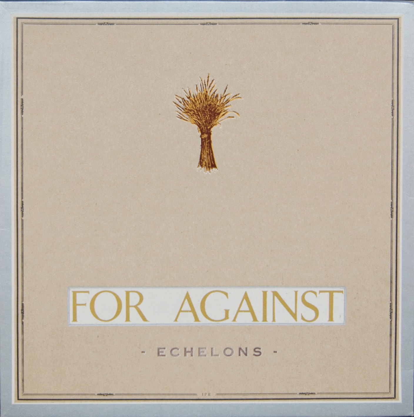 Paperboard record sleeve for the band, For Against's album, "Echelons". Recto: front cover: graphic rendition of a bouquet of wheat in golden rod and maroon. Below the graphic is the is a white rectangle outlined in metallic silver with the band's name is antique gold centered within it. Underneath that is the title of the album. A series of borders surround the composition: two black, followed by a white and finally by a thick metallic silver border. Verso: Top flap has multi colored border that follows along the top 3 sides of the flap, followed by an arroq and IPR's logo. The backcover has an antique gold banner on the bottom 3 sides w/ text and small decorative graphics. Center bottom is a yellow graphic that has info about IPP and the edition. Flap opens to a pocket where record is secured.