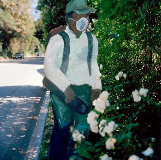 Cutout of gardener with leaf blower and mask staged by real rose bushes.