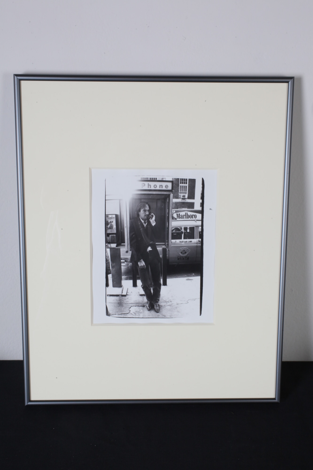 Black-and-white photo of Jon Gould stylishly using a N.Y city pay phone. There is a checkered cab in the background that has a Marlboro advertisement on its roof.