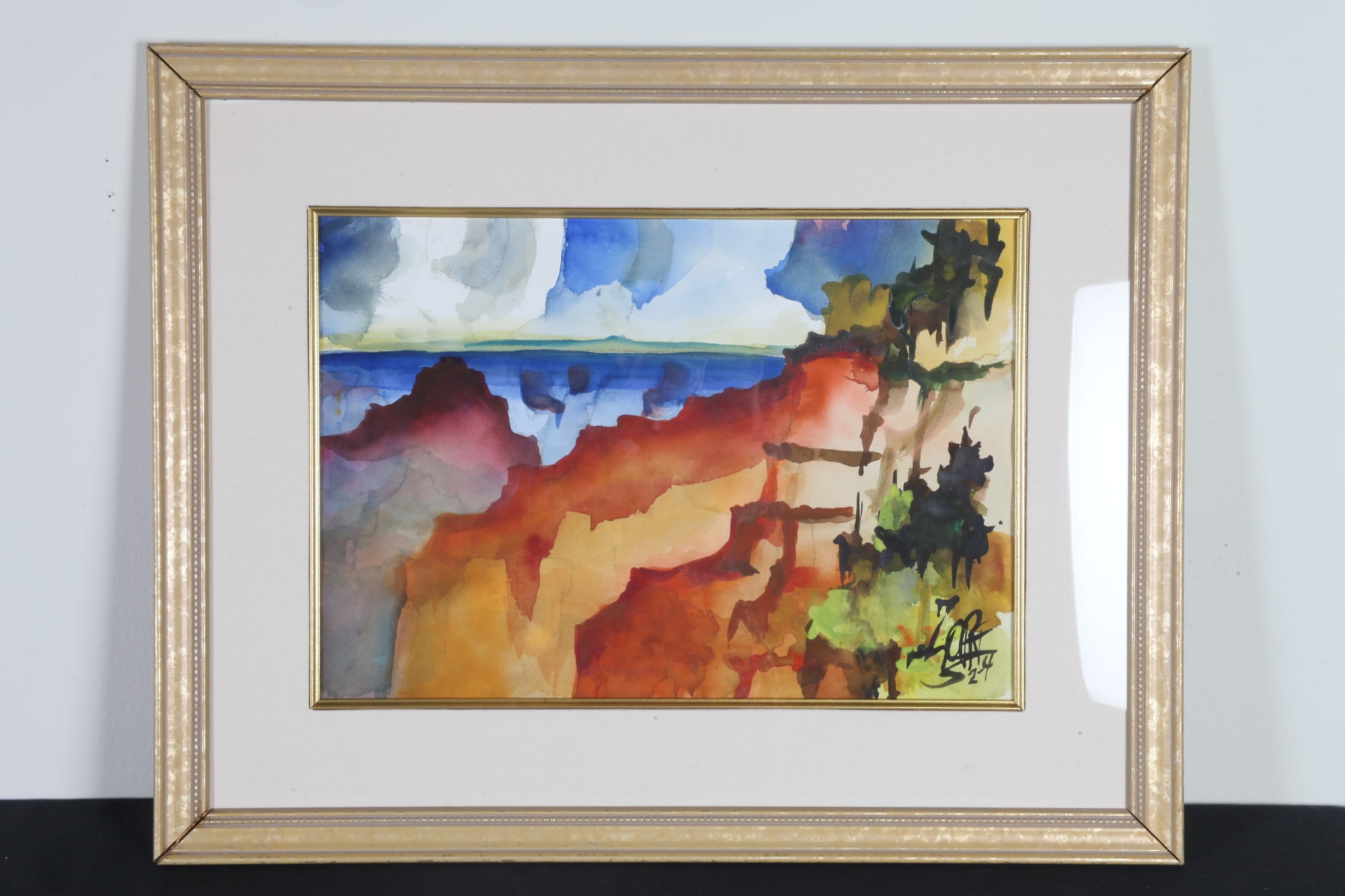 A vibrant landscape painted in gestural style depicting a cliff side overlooking a body of eater with clouds.