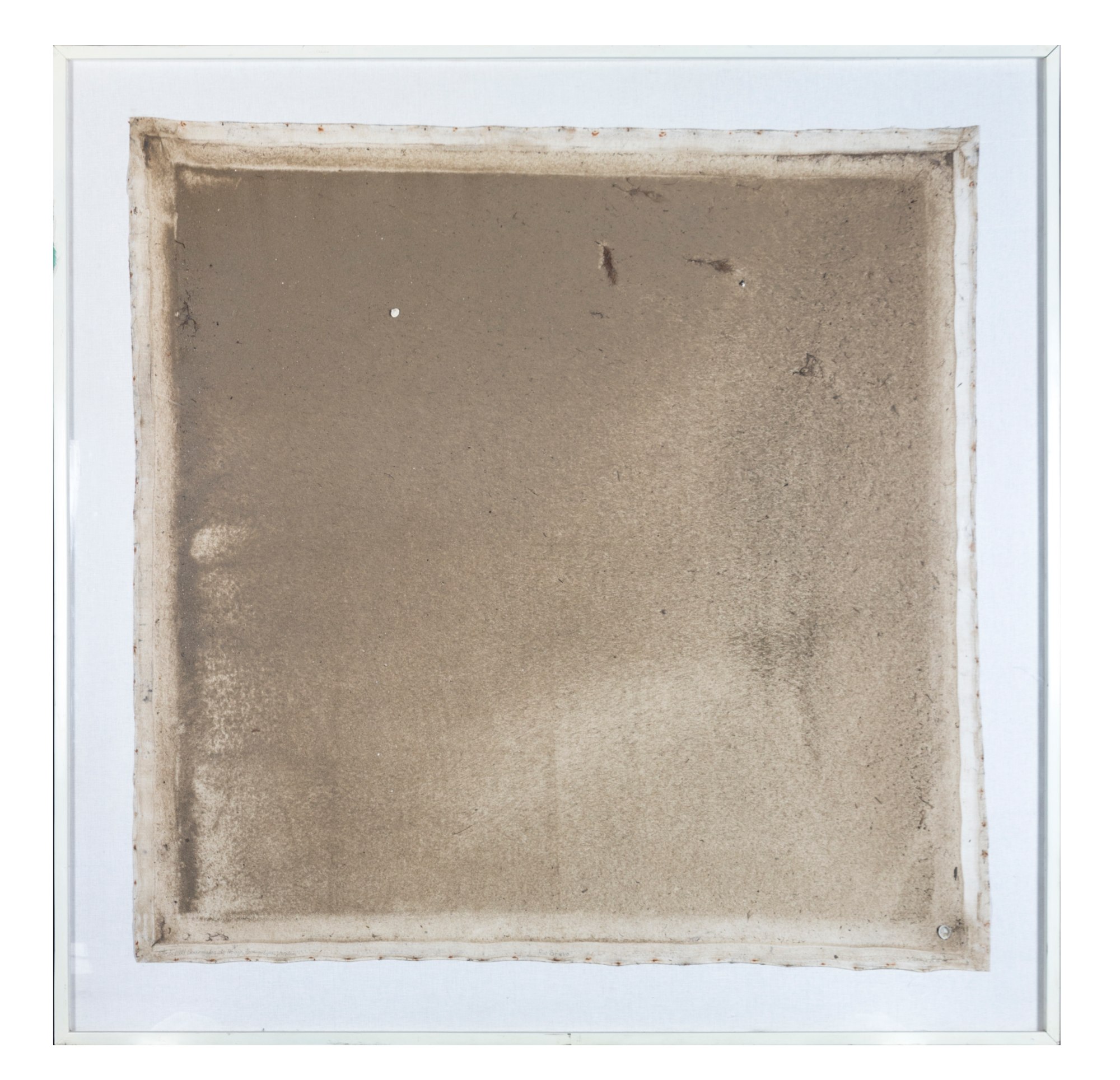 Sand from the Rio Bravo, unevenly adhered to a linen support. Sand is most dense in the upper left area of the composition. There are small shells, shell fragments, and plant debris throughout.