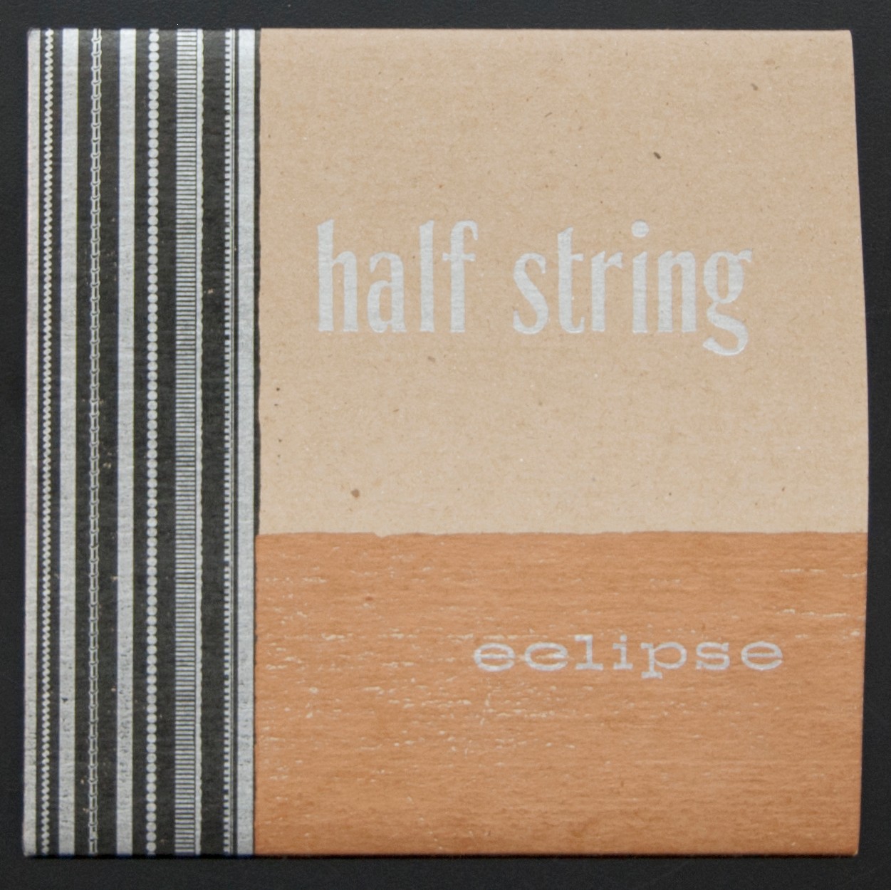 Arc-fold cardboard album cover for the band, Half String's album "Eclipse". The cover is color blocked: black vertical rectangle on the left side is decorated with various vertical patterns in metallic silver. The areas to the right of the black area are also rectangular: the top area is the natural brown of the cardboard, the bottom rectangle is a metallic copper. Text is metallic silver. Verso: similar composition, except the black are is on the right and the area w/ bare cardboard is larger. Text on back provides info about the album and has the printer's acronym, "ipr".