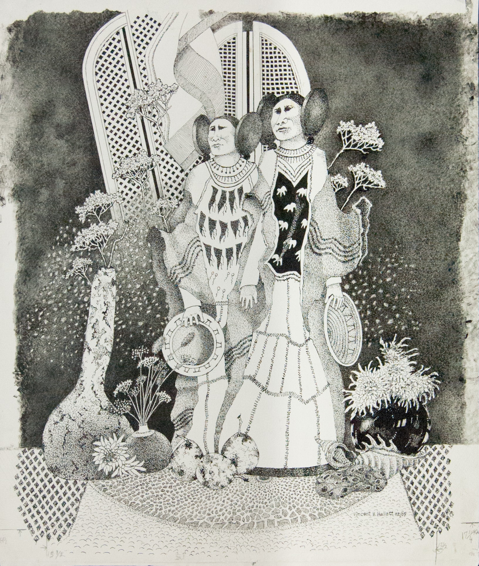 Black- and- white drawing of a ceramic figurine of 2 Native American women wearing large hair whirls and flowy dress. The are surrounded by small flowers and gourds.