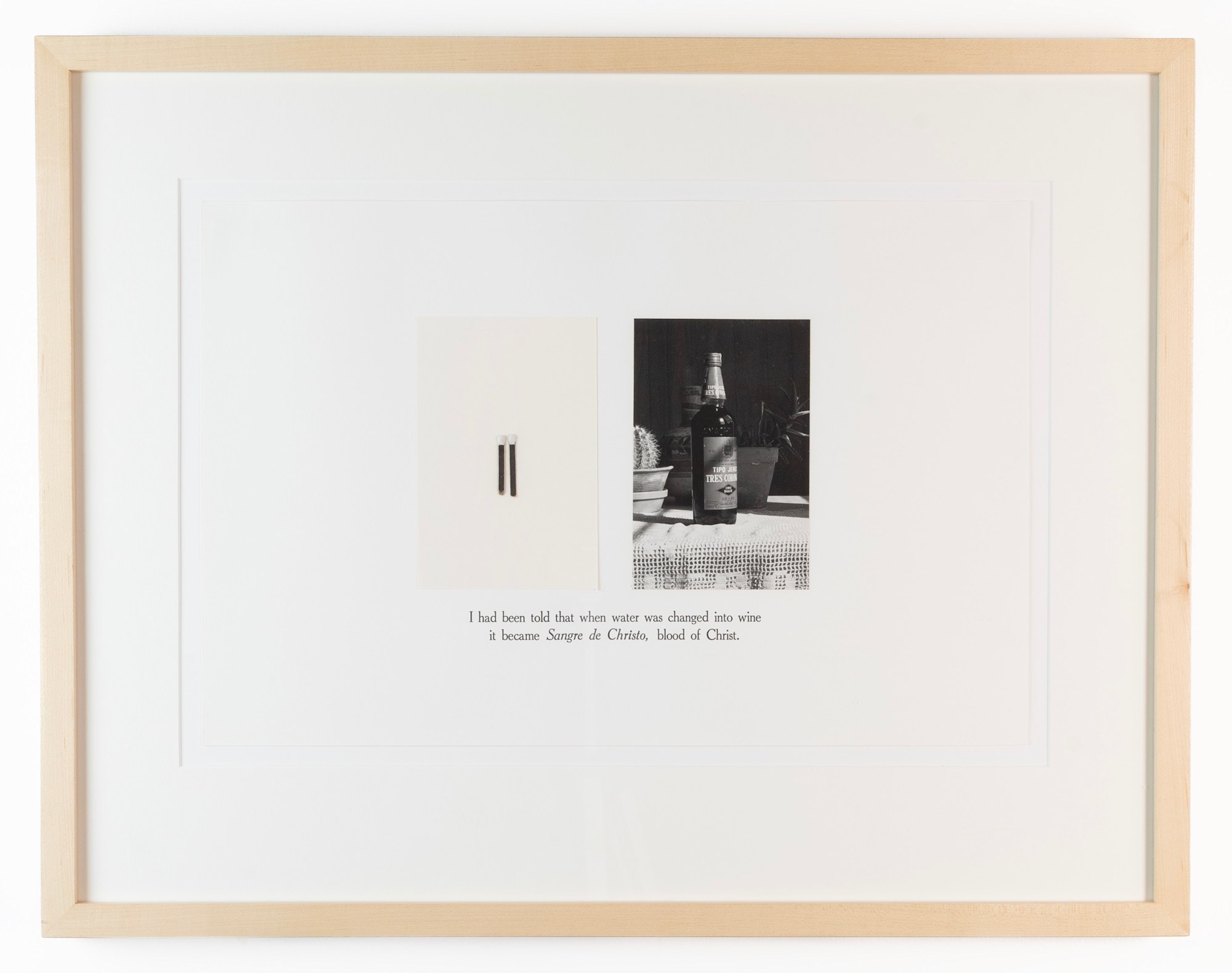 The left piece is comprised of two white tip matches, mounted close together, on the piece of paper. It is an image of a beer bottle atop a table with a lace tablecloth. There's a potted cactus next to the beer bottle. Under the pieces is black text that reads: "I have been told that when water was changed to wine, it became Sangre de Christe, blood of Christ."