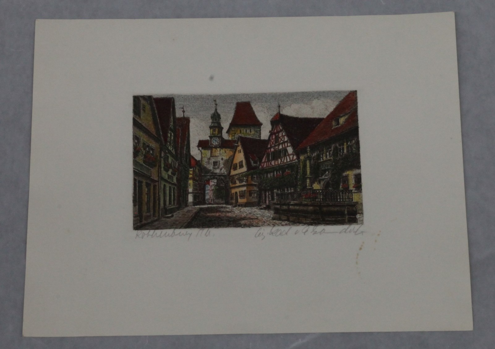 Etching is of a quaint European town with cobblestone street and side walks. There is an arched walk way in the background and a clock tower