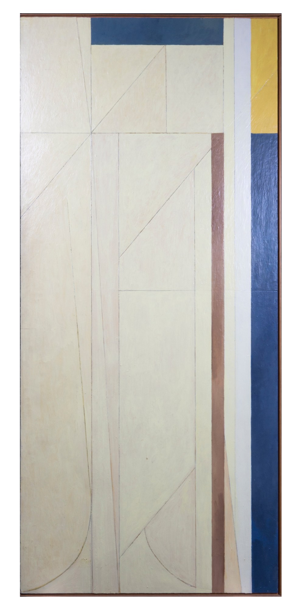 Abstract composition of vertically orientated rectangles with thin lines drawn in-between that create triangles and quadrilaterals .