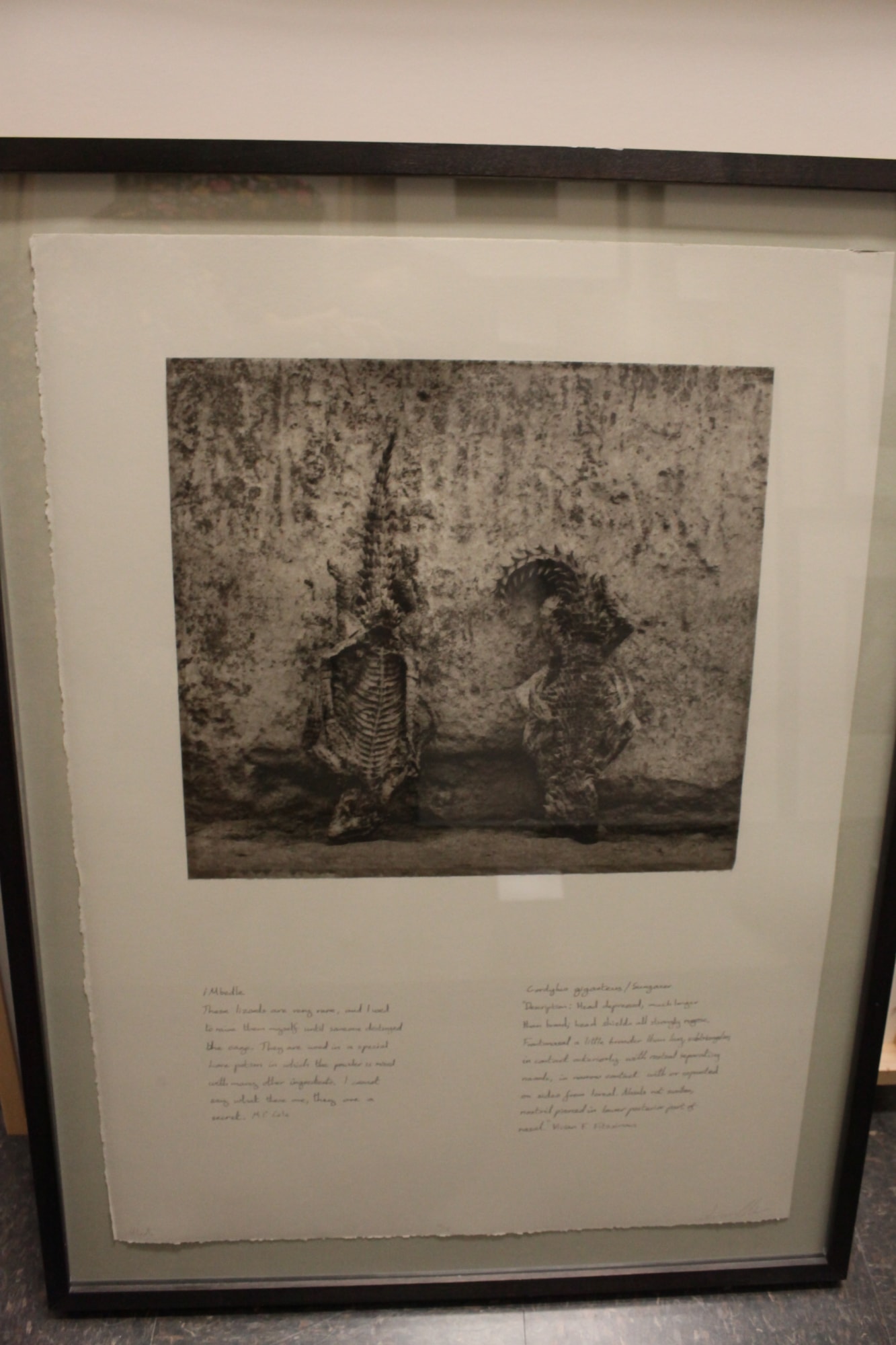 Photogravure of 2 dead sun gazer lizards. Their texture camouflages with the wall they are propped up against. The lizard on the left has it's rib cage exposed. The lizard on the right has it's back showing. Both are balanced on their heads. Under the image is two columns of text credited to Vivian F. Fitzsimmons.