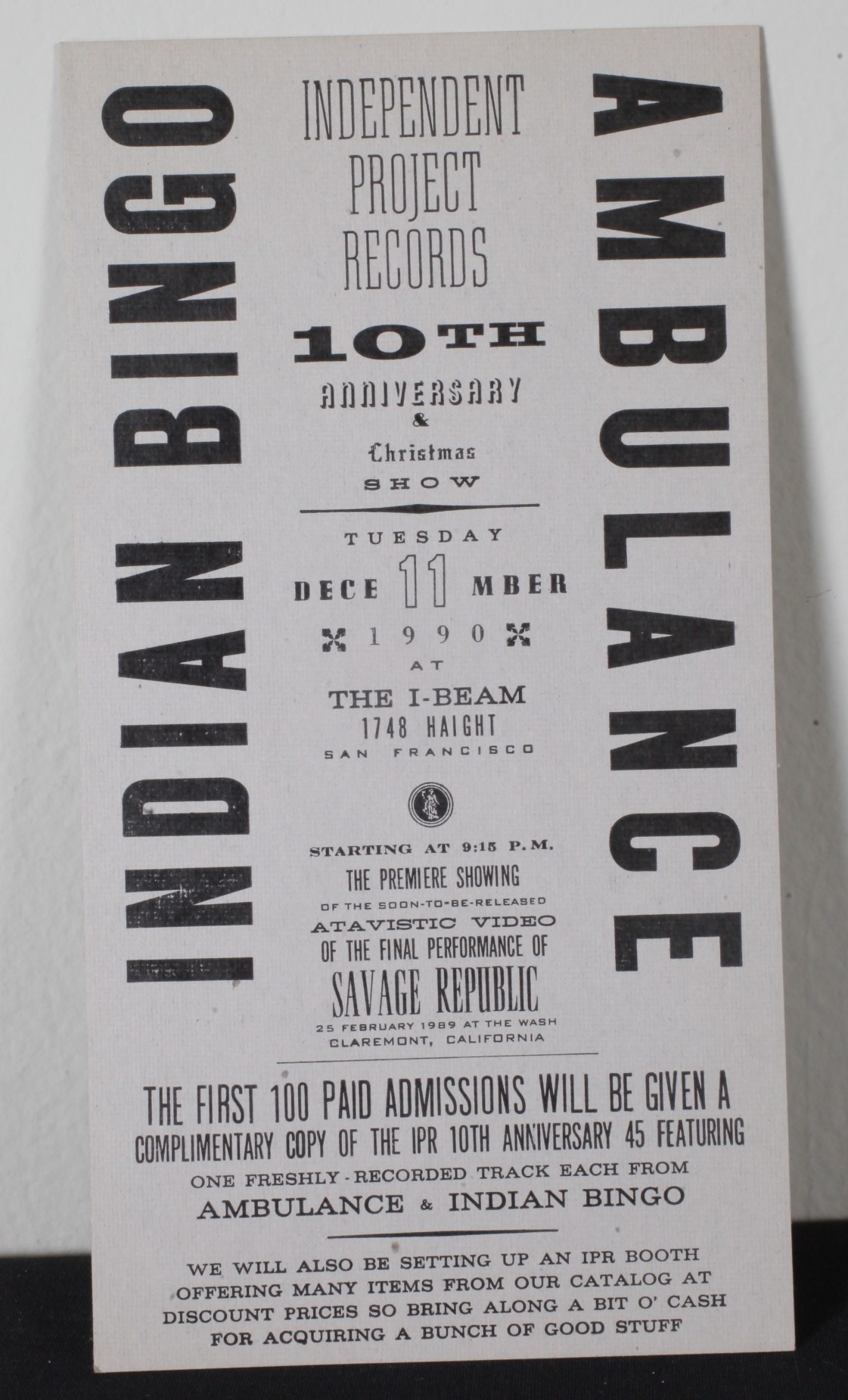 Promotional flyer card for Independent Project Records 10 year anniversary. Bands to perform are Indian Bingo, whose name flanks the left side of the card, and Ambulance, whose name flanks the right side of the card. In between the two band names is smaller font with info about the event, text is separated with small decorative graphics/boarders. Portrait orientation, verso - blank.