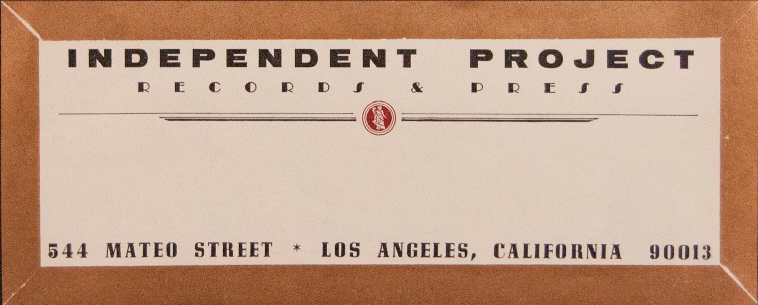 A small rectangular print. It has a bronze border. It reads: Independent project: records and press. 544 Mateo Street. Los Angeles. California. 90013.