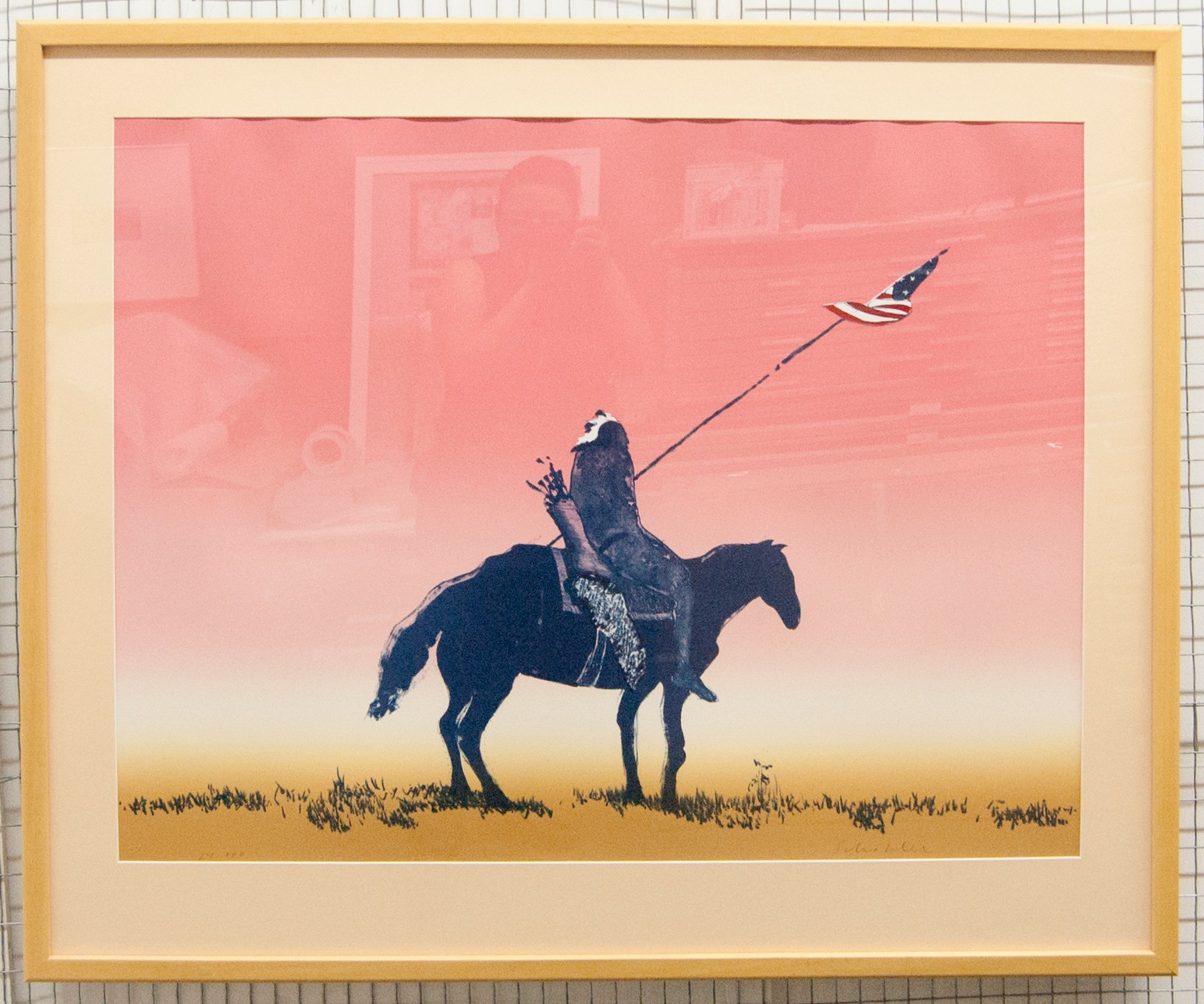 Native American man with a quiver and holding out an American flag on a long pole He is ridding a horse against a sunset colored background. The image is a deep indigo color with white highlight. The USA flag is red, white, and blue. Background is a gradient.