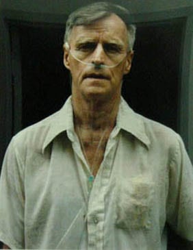 Portrait of torso of a man, "Joe Davabent" wearing a light colored collar shirt. He's old, Caucasian and is wearing a nasal cannula.