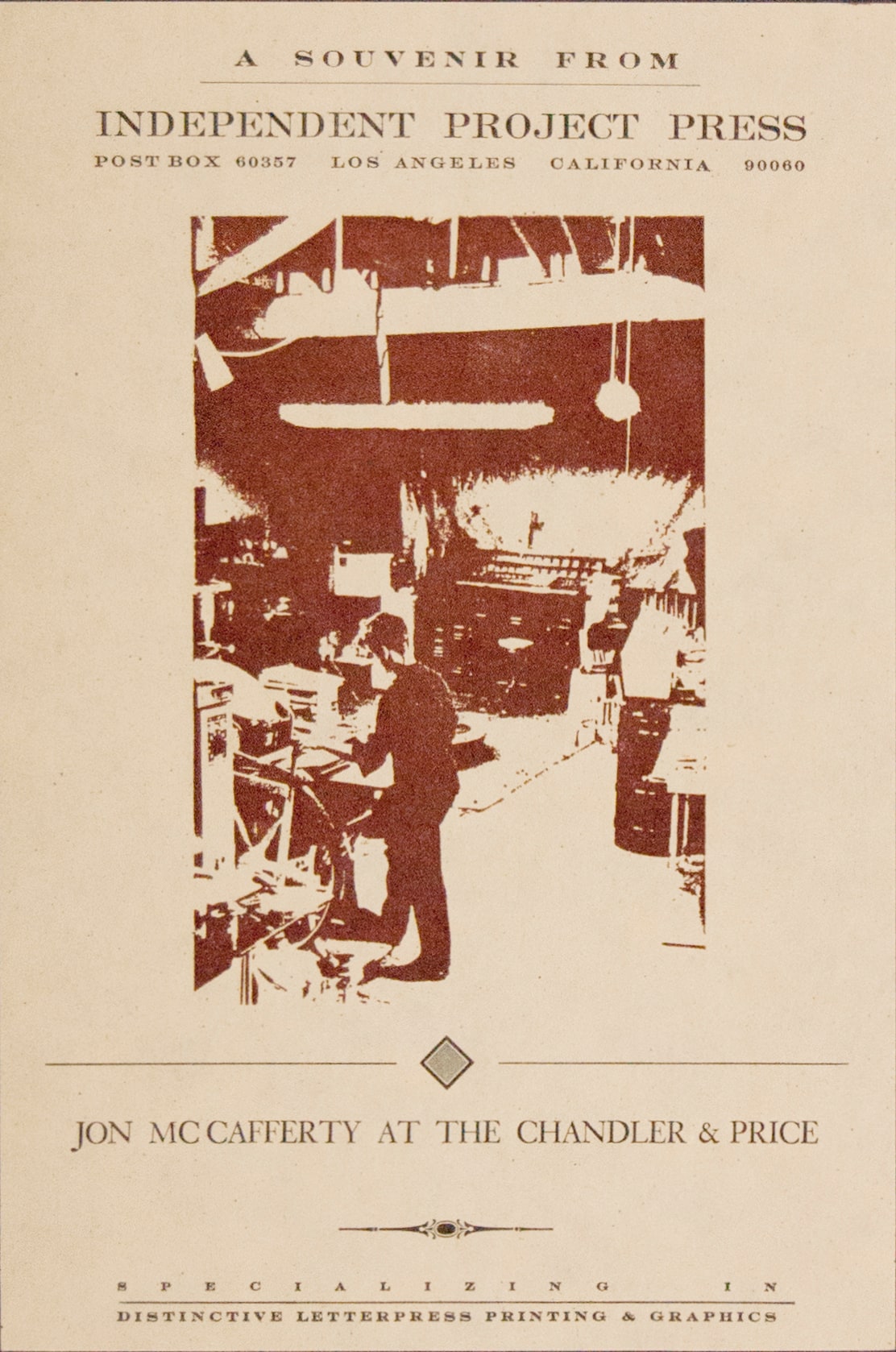 Promotional card. Two-toned reproduction of a photo of a man working a printing press. Above the image text reads: :A Souvenir from Independent Project Press followed by the business's address. Below the image is a diamond graphic followed by the photo's caption and description of IPP's services. All text is black and graphic is rusty red on pale yellow background. Verso is blank and the natural brown of the paper.