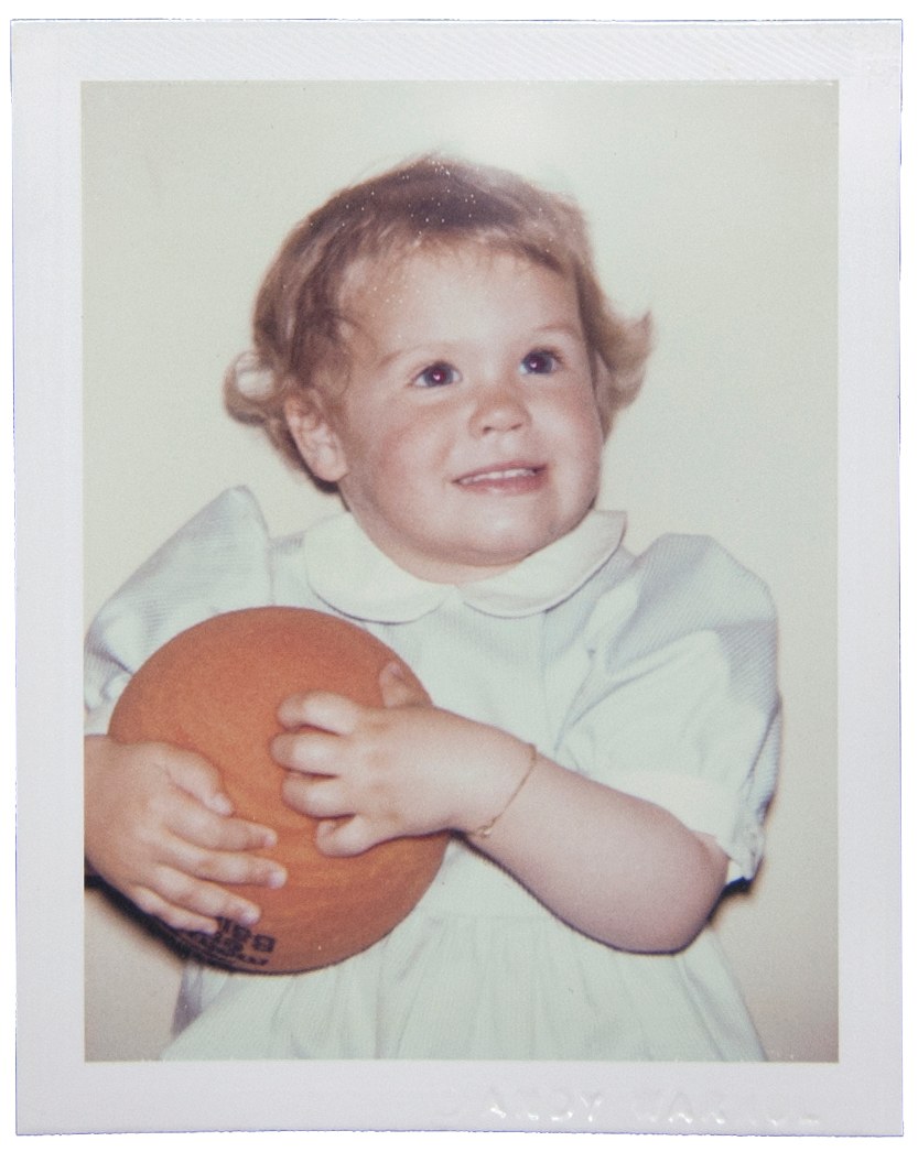 Portrait of a baby girl, Klaus Kramer's daughter , in a blue dress, holding an orange ball. She is set against a solid off-white background.