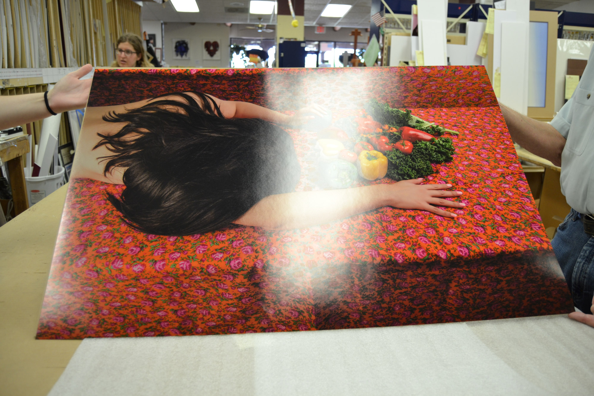 A woman (Monica Martinez) lies, topless a red patterned tablecloth. Her left hand is reaching for a green bell pepper, which is sitting in front of a still life of other vegetables. Her hair is black and her nails are painted pink.