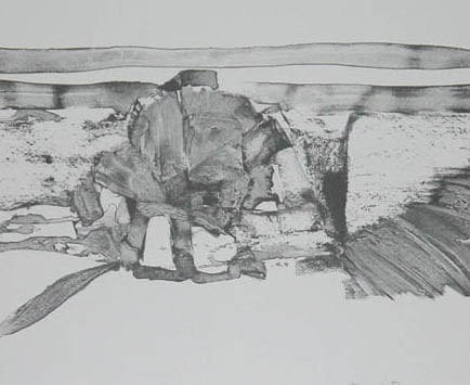 Gestural composition of a group of rocks. Foreground is plain, horizon demarcated by a single stroke.